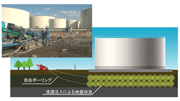大成建設は、これまでに、地震時の液状化や側方流動による構造物や護岸等の倒壊、豪雨による堤防・盛土の崩壊などの大規模自然災害に対応する地盤強化技術を幅広く手掛け、国土強靭化の一役を担ってきました。特に、稼働中・供用中の産業施設・インフラ構造物を大きな被害から守るために、構造物の直下や建物内部など、特殊な施工条件下での地盤強化技術を数多く保有しています。